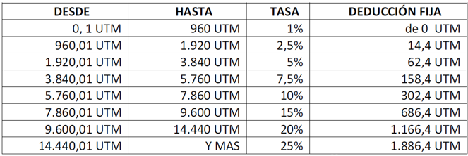 El impuesto a la herencia es un impuesto con tasas progresivas por tramos. Para poder determinar el monto del Impuesto a la herencia, debemos aplicar la siguiente tabla: